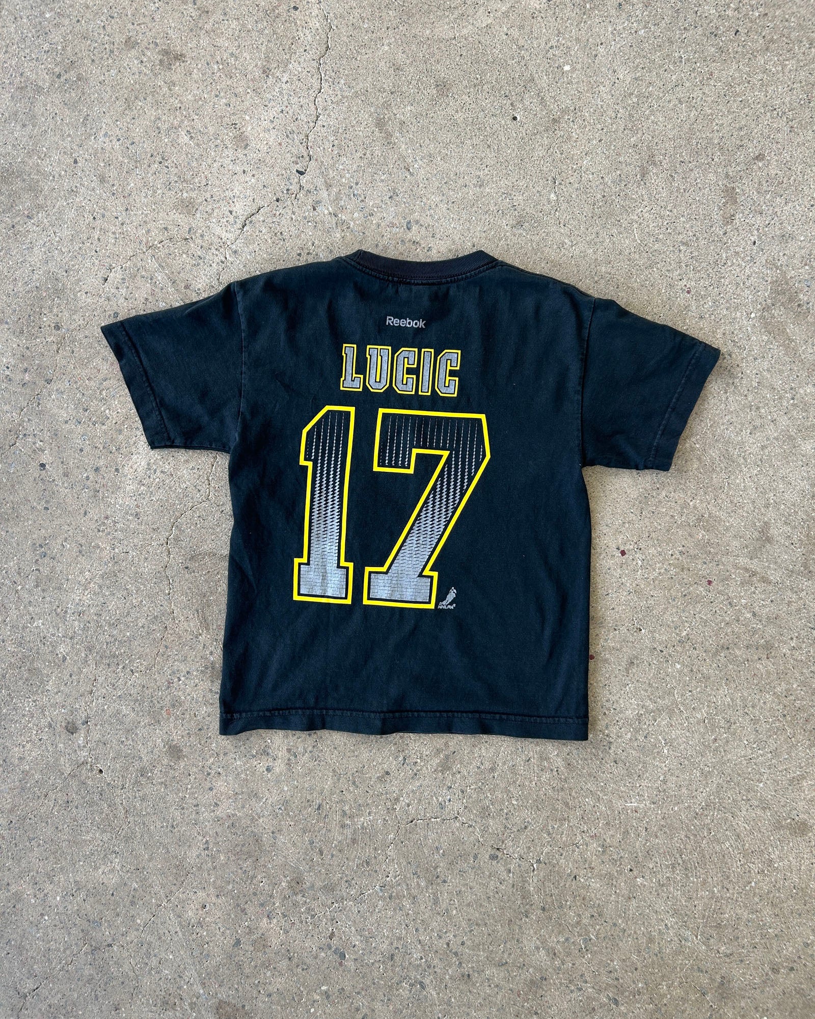 short sleeve supporter t-shirt with 'boston bruins' logo screen printed on front and 'lucic #17' on back