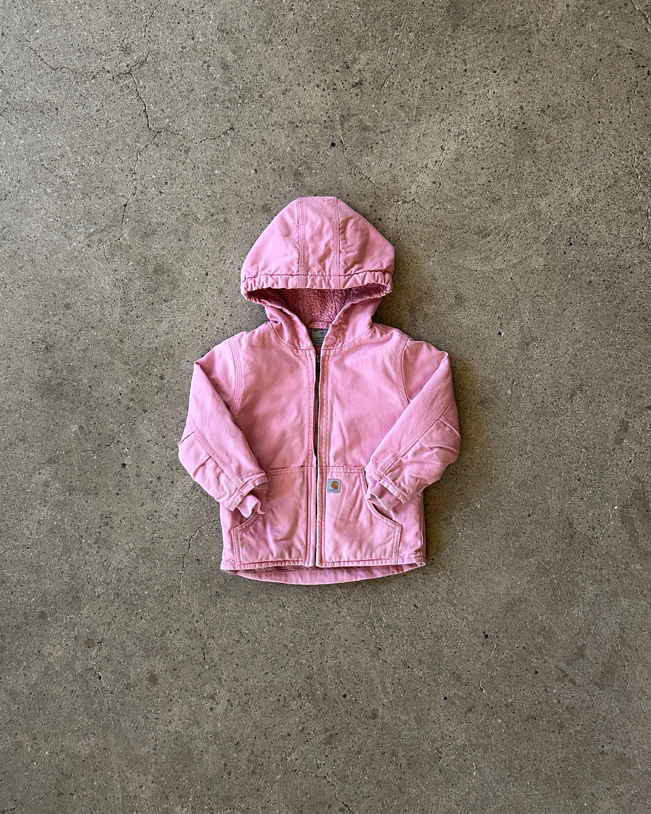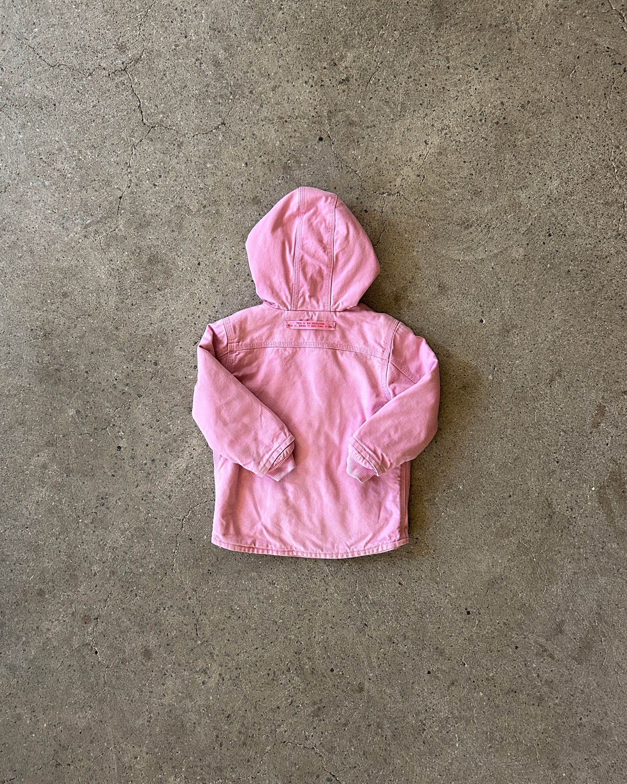 faded pink work wear jacket with pink fleece lining and hood