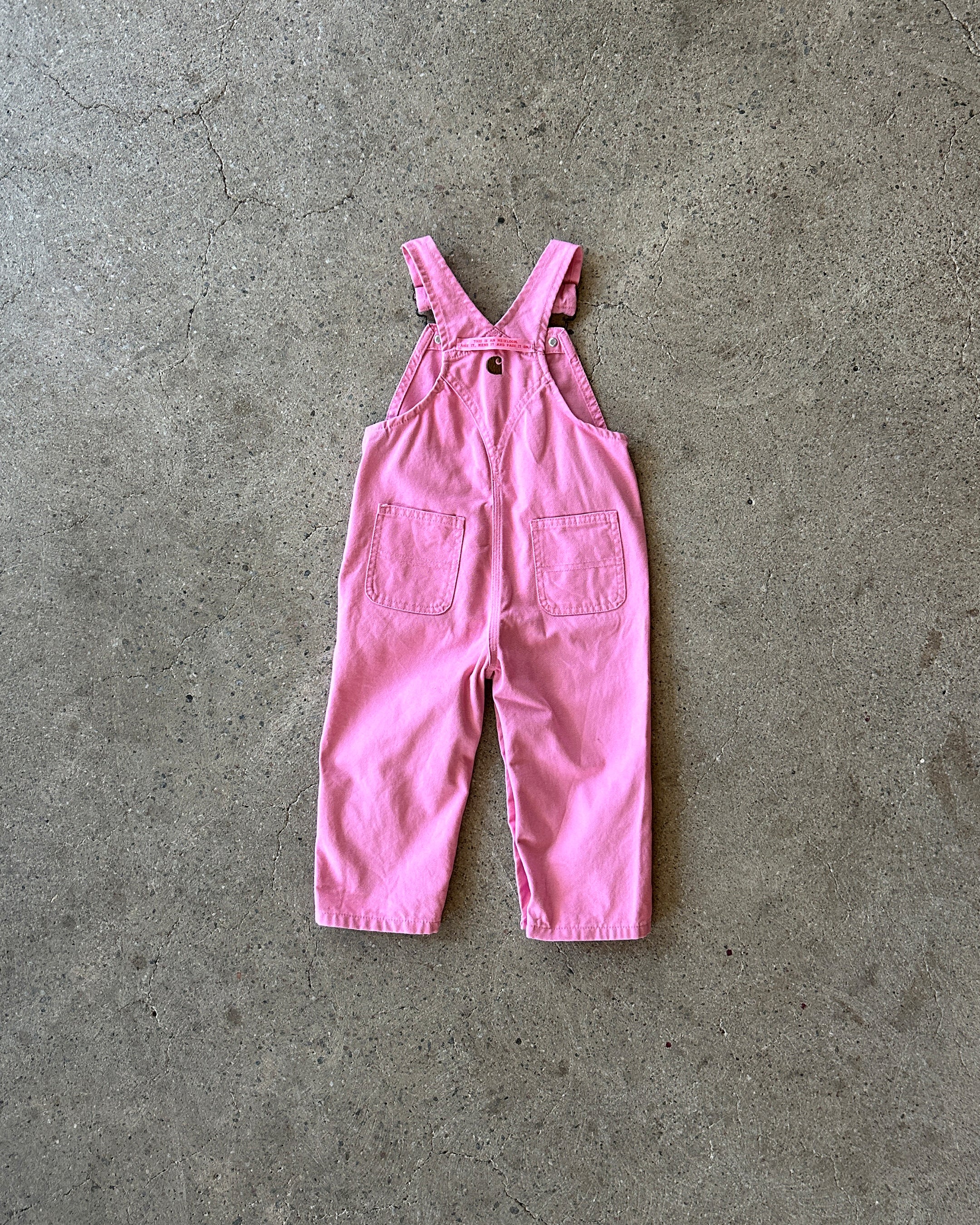 faded pink dungarees with snap buttons in crotch and heart-shaped buttons