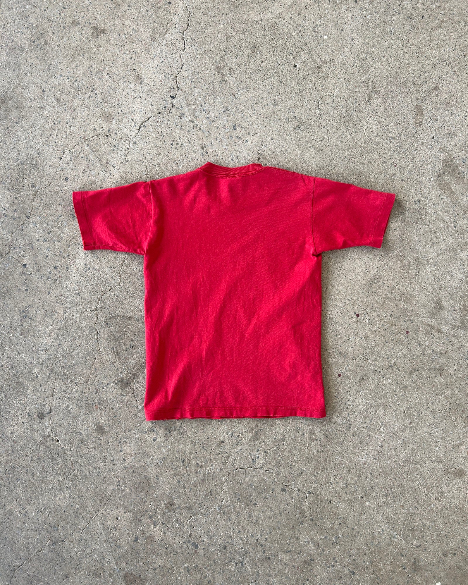 red single stitch t-shirt with multiple screen printed mickeys on front