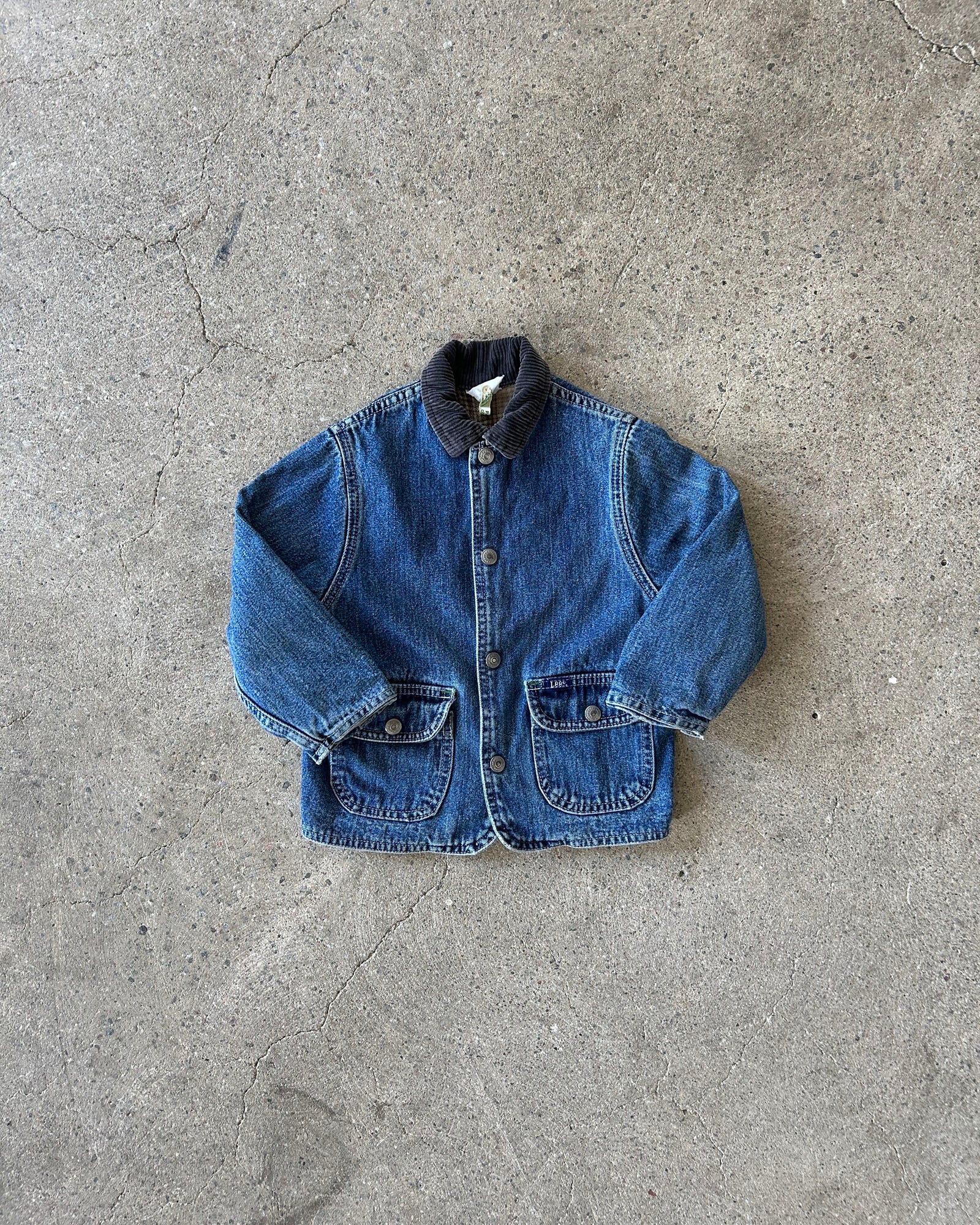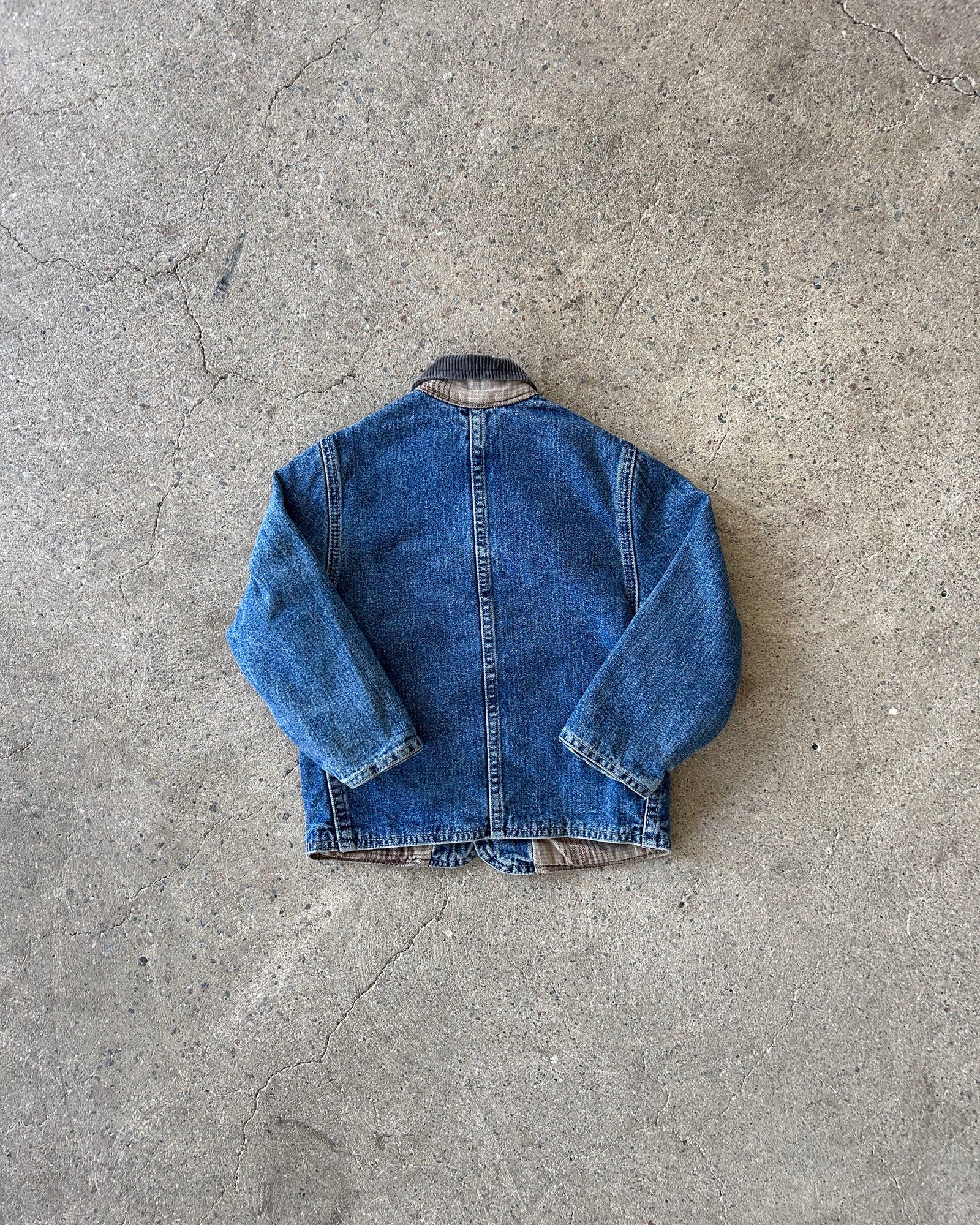 vintage lee 2-pocket chore denim jacket with black corduroy collar, lined in flannel plaid pattern