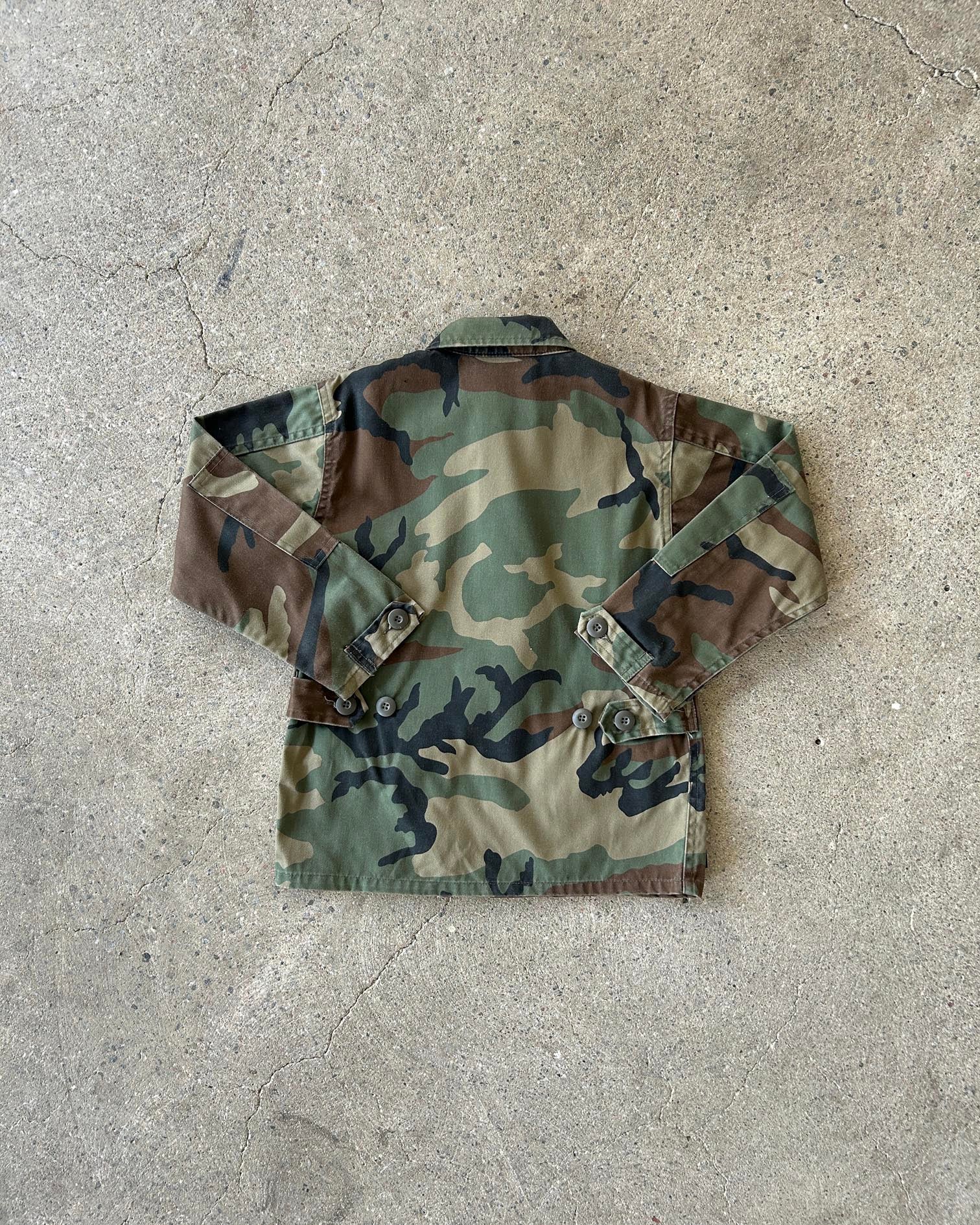 classic 4-pocket style bdu jacket in faded woodland camo pattern