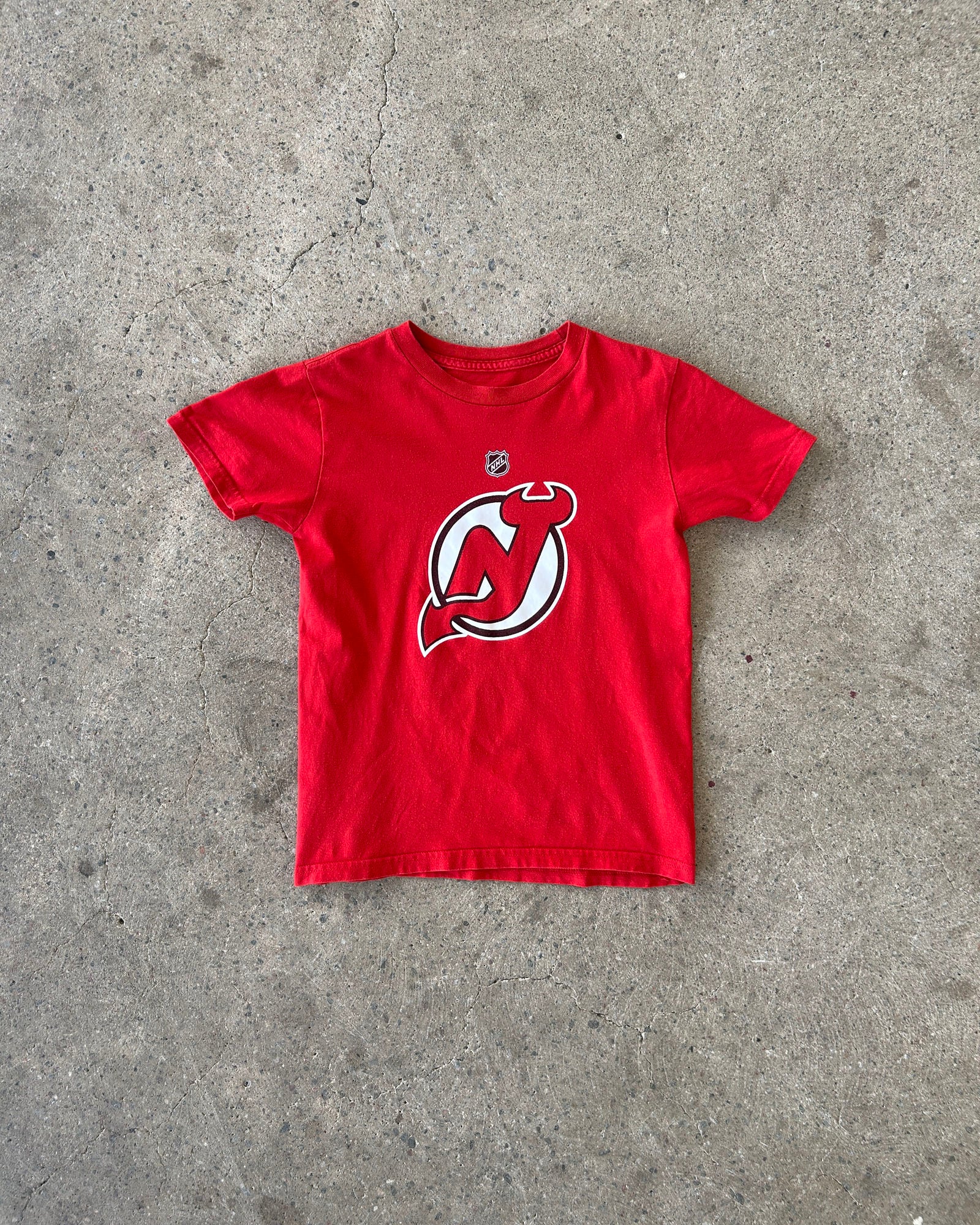 red short sleeve supporter t-shirt with 'new jersey devils' logo screen printed on front