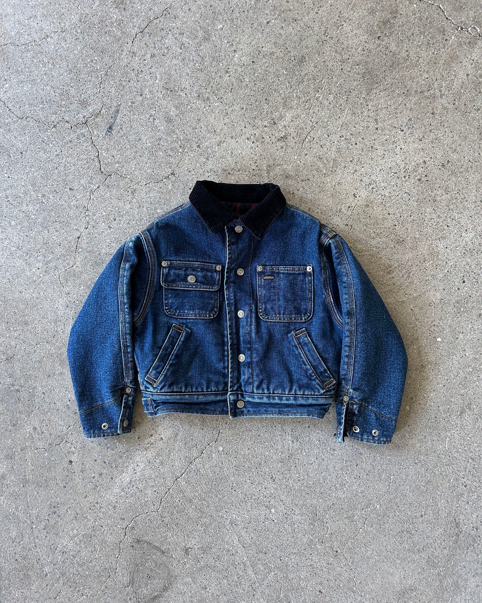vintage 90's polo authentic dungarees 4-pocket denim jacket with black corduroy collar. the jacket is reversible in red flannel plaid pattern, making it two jackets in one