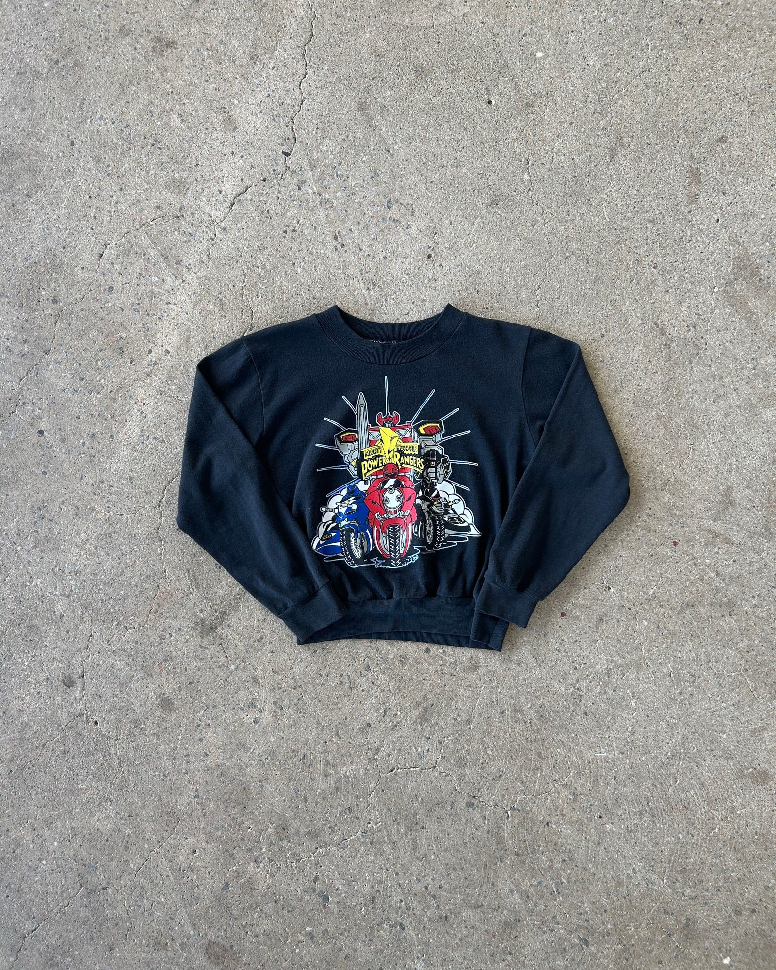 vintage black long sleeve sweater from 1994 with screen printed graphics of the mighty morphin power rangers on front