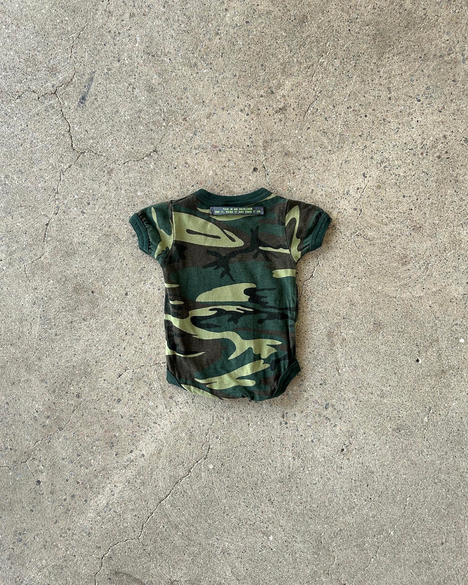 faded short sleeved body with woodland camo pattern and snap buttons in crotch