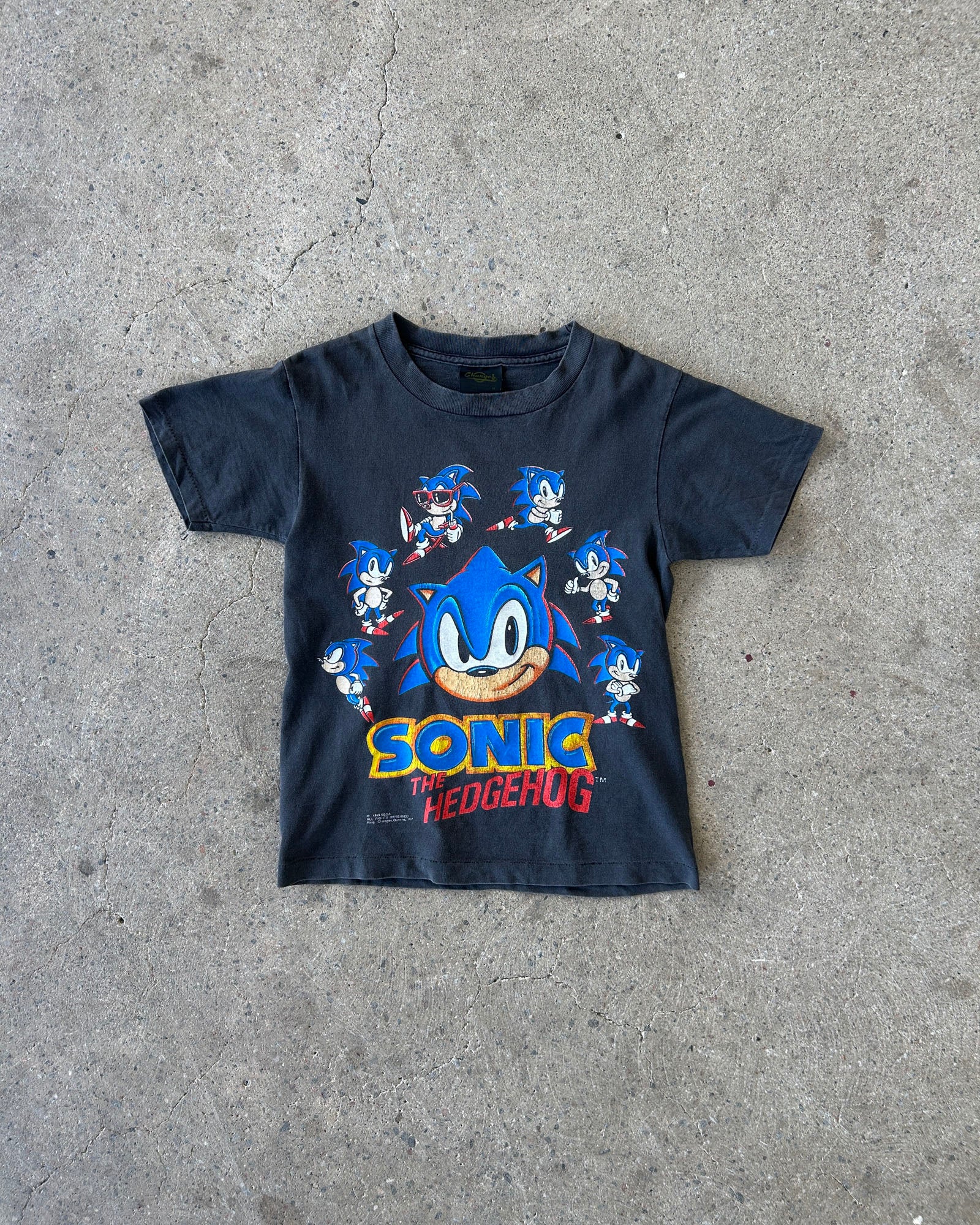 black single stitch t-shirt with faded screen printed graphics of sonic front and back