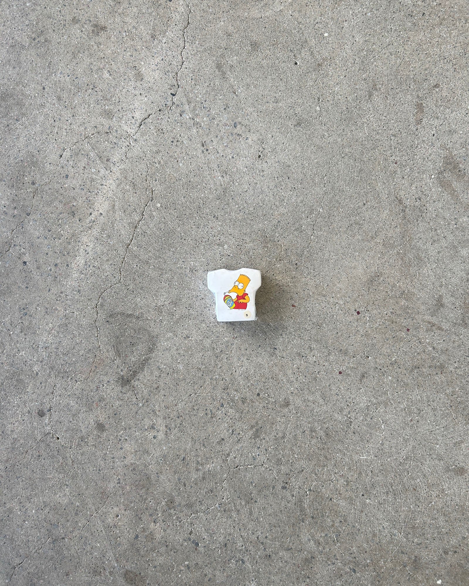 deadstock t-shirt from 2000 that swells when dipped in water. screen printed graphic of bart drinking a slurpee.