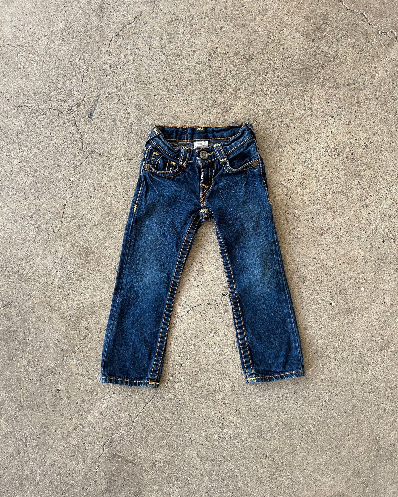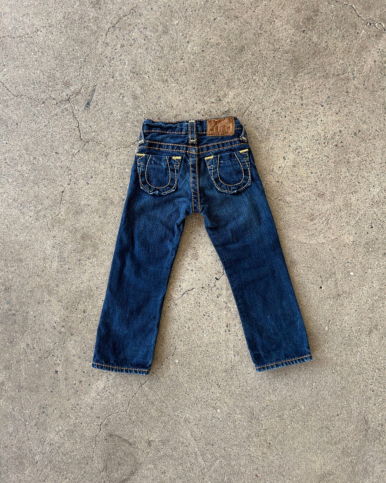 early 00's denim jeans with signature big t stitching and horseshoe detailing on back pockets, straight fit with dark wash color