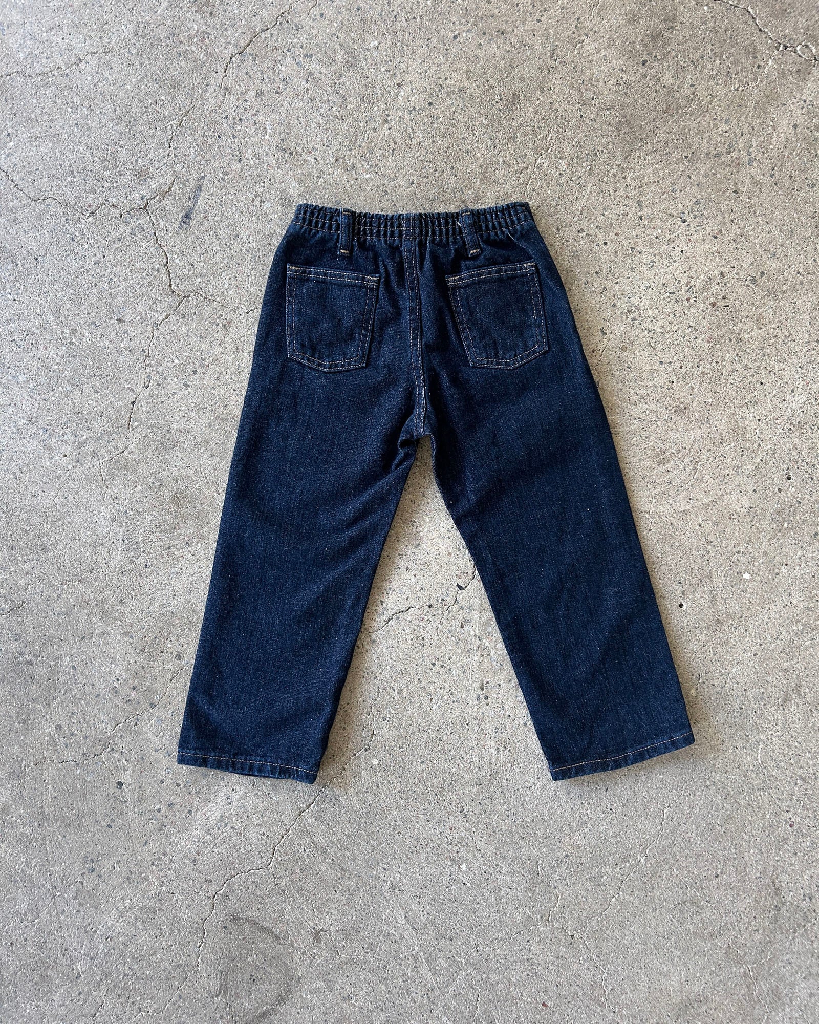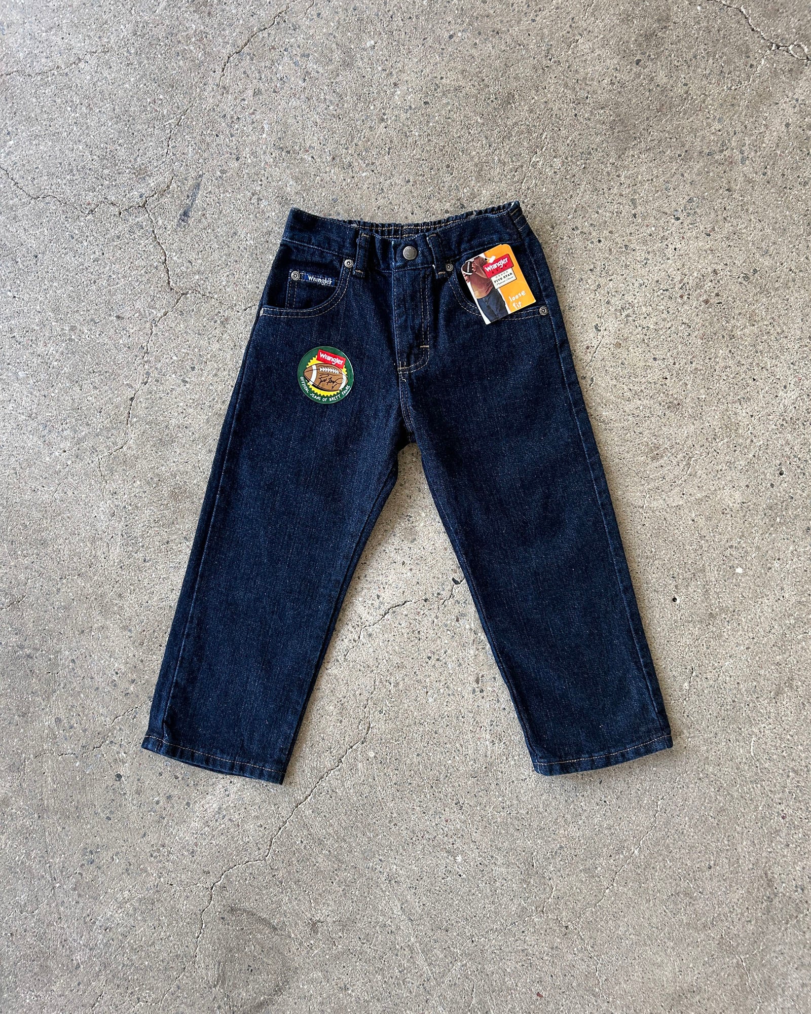 deadstock 5-pocket wrangler jeans with original tags and stickers. bret favres official jeans in dark unwashed color and expandable waist